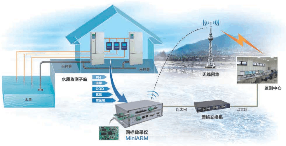 水質(zhì)在線監(jiān)測預(yù)警裝置:對環(huán)境數(shù)據(jù)進行整合處理,利用GPRS/GSM系統(tǒng)將數(shù)據(jù)傳輸?shù)蕉鄠€環(huán)境管理部門,并對各類異常數(shù)據(jù)進行實時報警。
